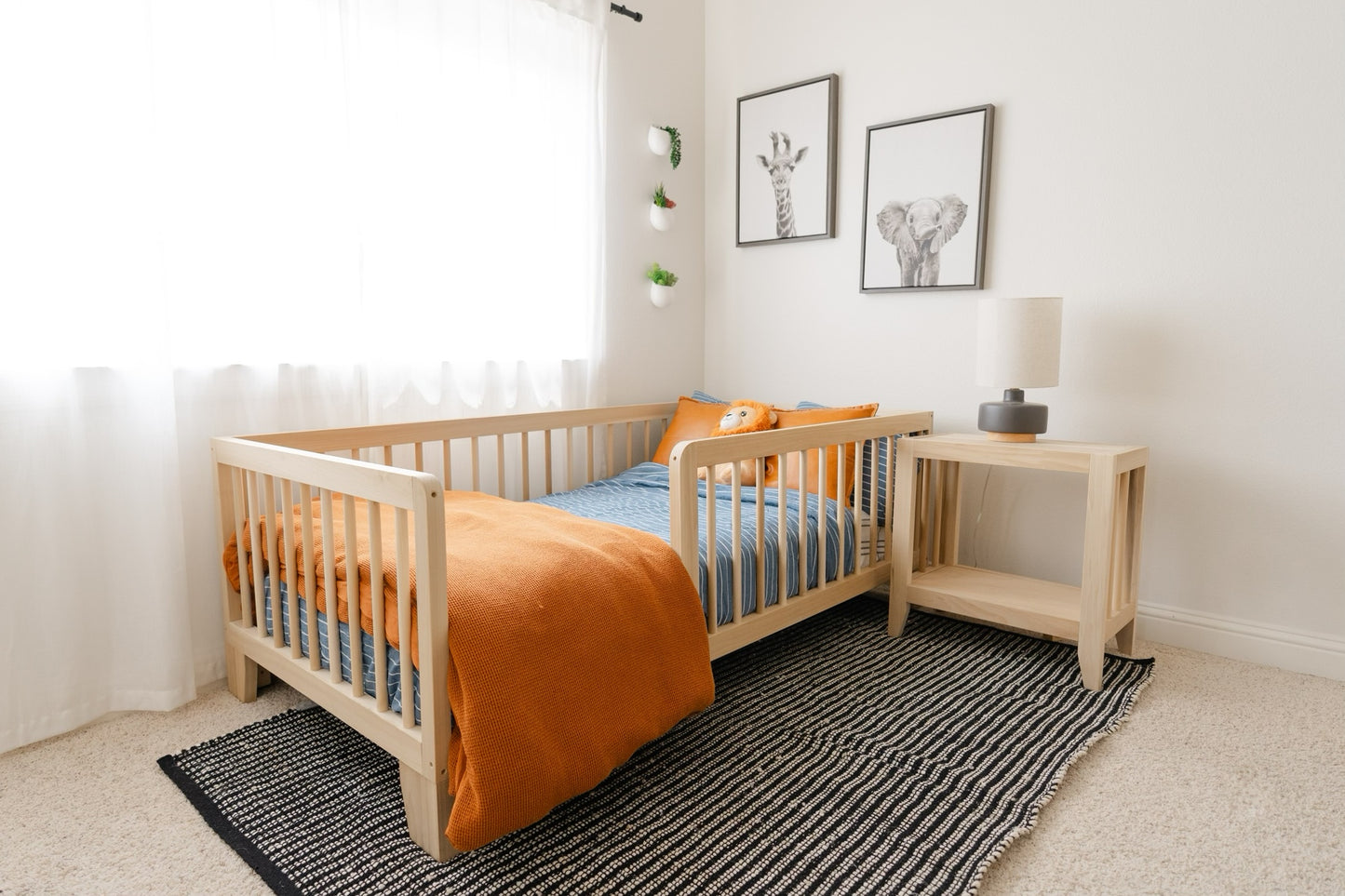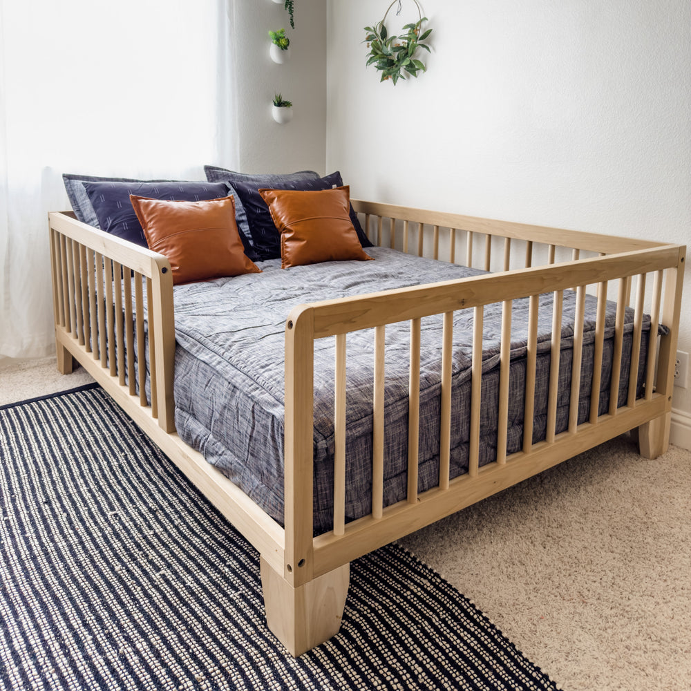 We transitioned our 2 year old from his crib to this Montessori floor bed and it totally improved our bedtime routine and quality of sleep! He began refusing his crib and it took over 1.5 hours to get him to fall asleep! Now he willingly cuddles up in his floor bed and falls asleep within 30 mins. He can independently get in and out - but the railings help him feel safe and prevent him from rolling out. I love the smell of the natural wood and how well it is made. We're planning on keeping this bed until he goes to college! :)